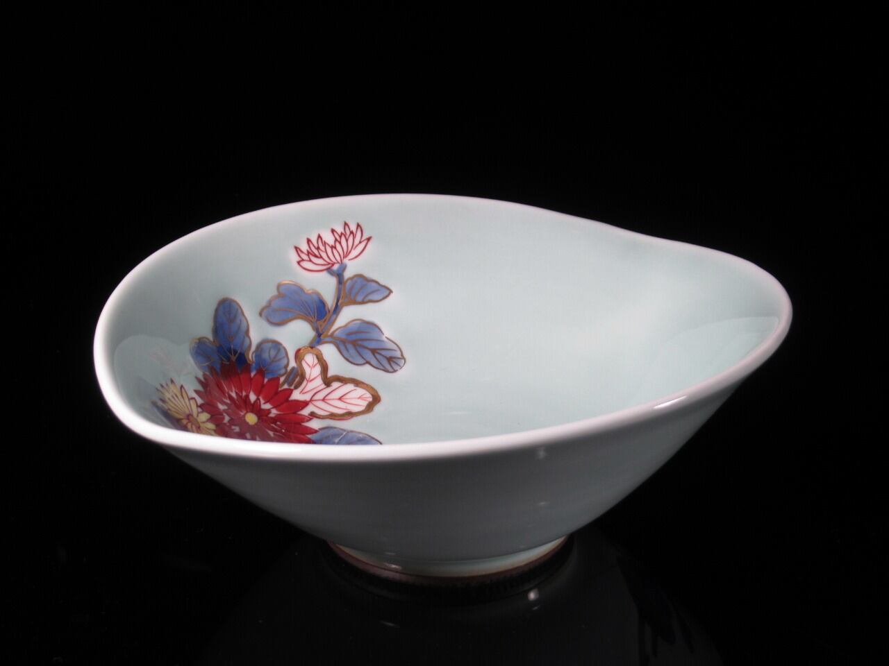 有田焼USED 青磁菊絵変型向付:美しい青磁の素地に、華やかな菊模様が施された変型向付は、独特の形状と色合いが魅力です。和のテイストを大切にしながらも、モダンな演出が可能なこの向付は、さまざまなお料理を引き立ててくれるアイテムです!