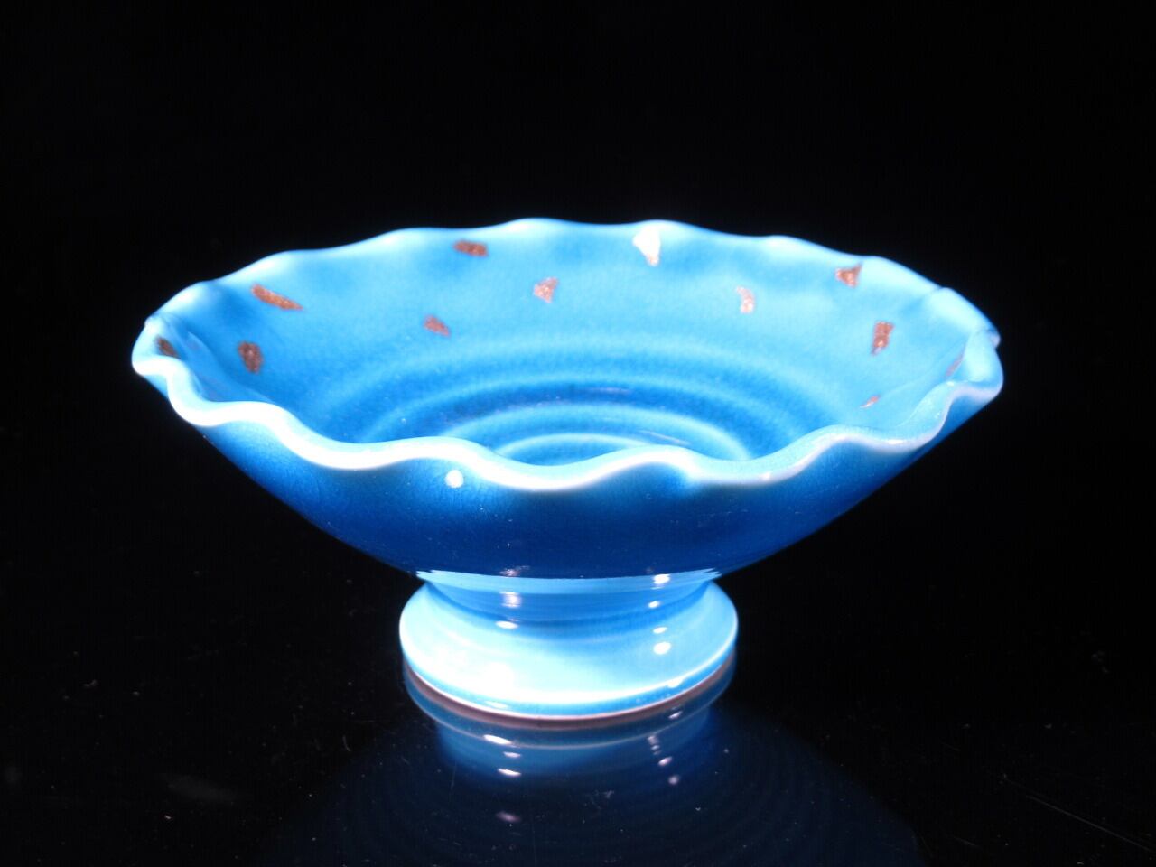 有田焼USED 青交趾金チラシ波渕高台小鉢:鮮やかな青交趾色に金チラシ模様が施されたこの高台小鉢は、和の美しさを存分に感じさせる逸品です。様々なお料理を引き立てる存在感があり、食卓に彩りを添えます!