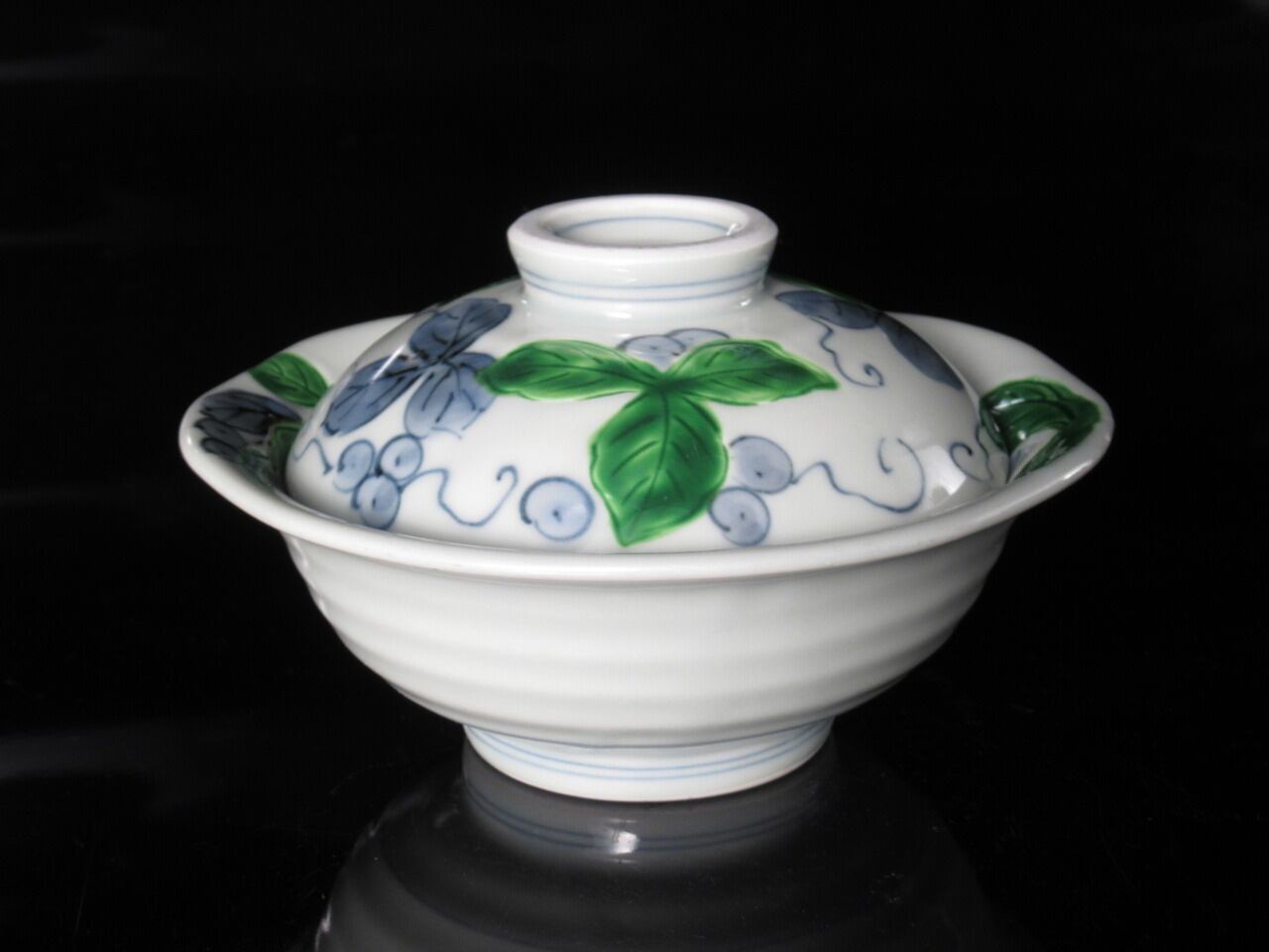 有田焼USED グリーン交趾ぶどうナブリ蓋物:美しいグリーンと、ぶどうの絵柄が華やかな印象を与える蓋物です。デザインはシンプルながらも豪華さを兼ね備えており、食卓を引き立てます。